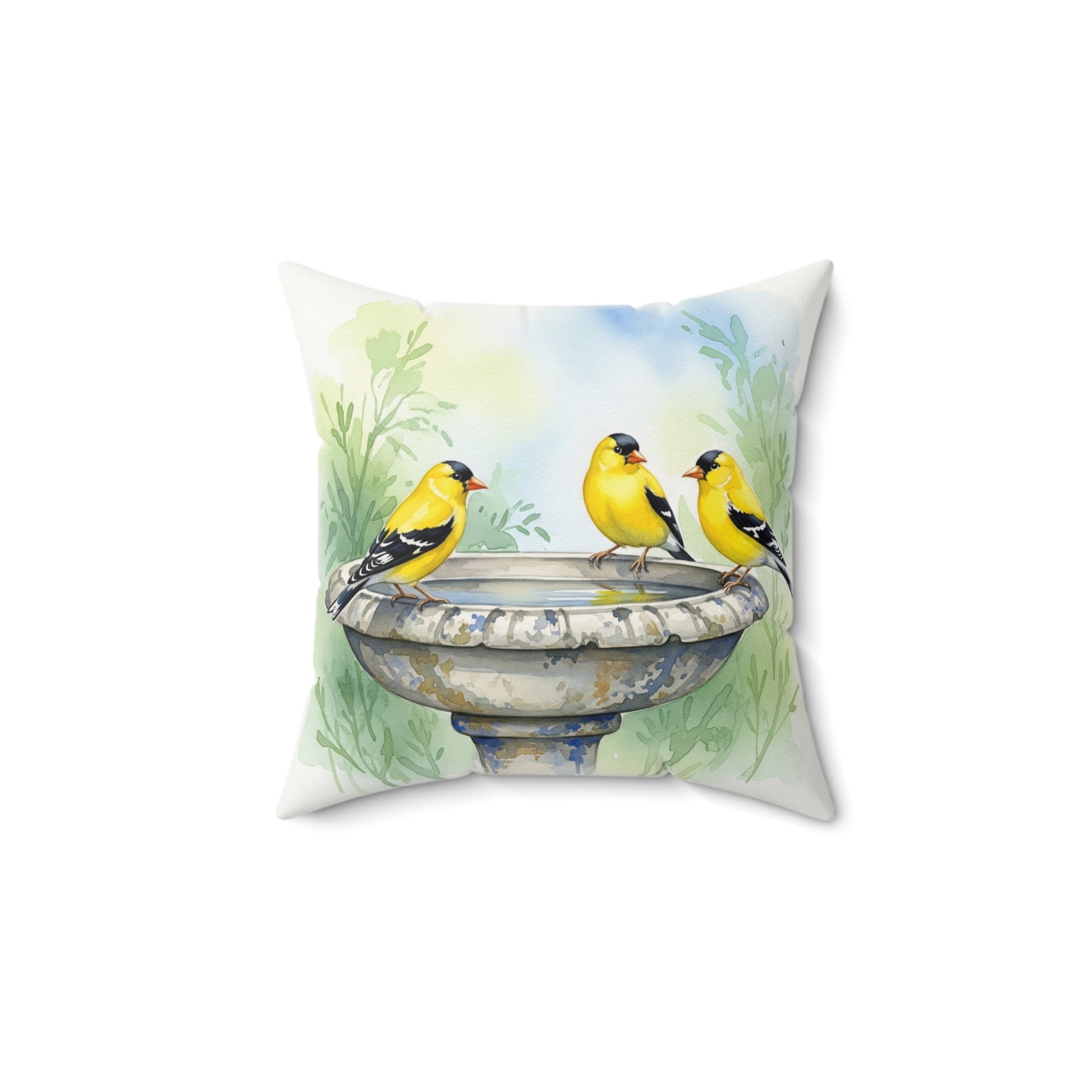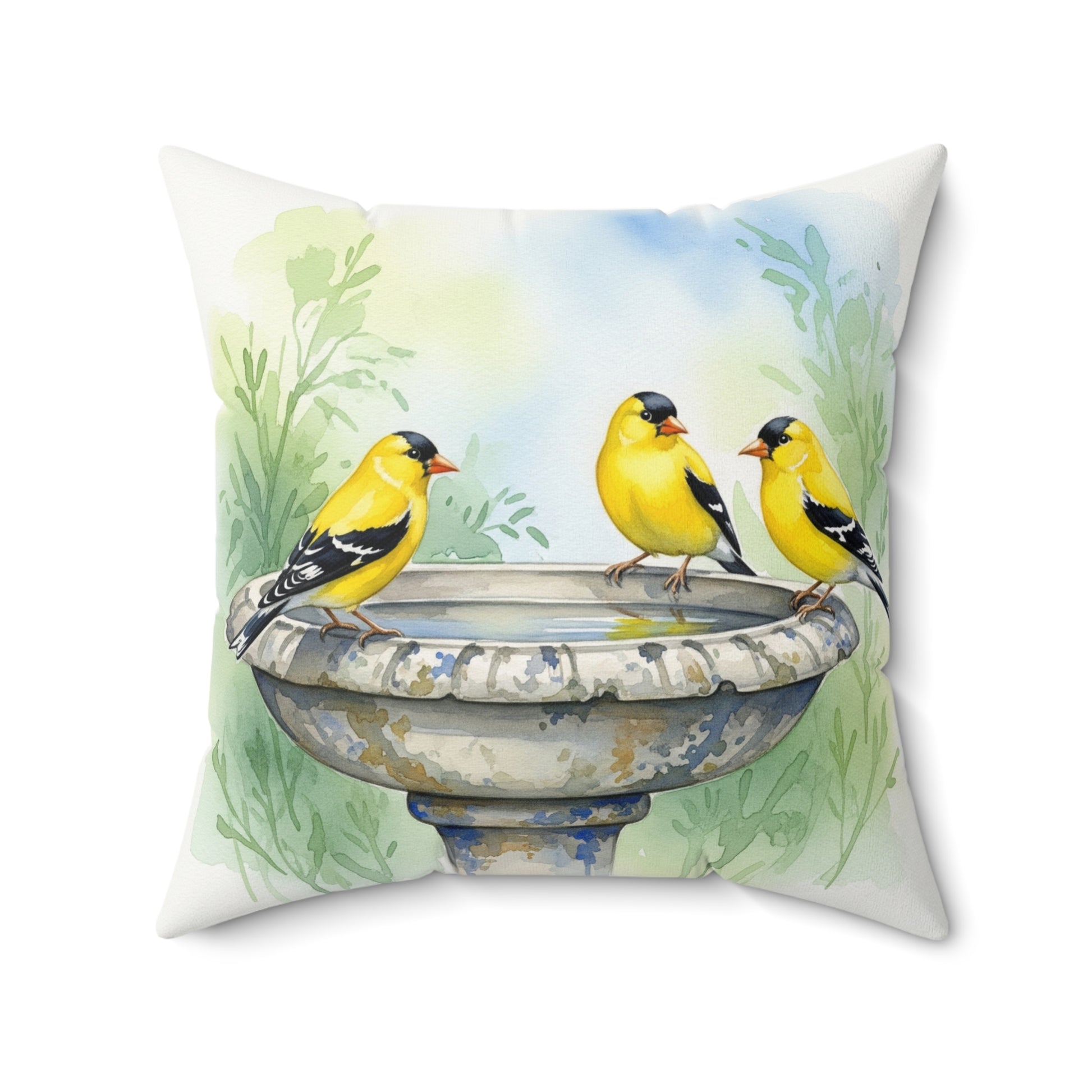 Cheerful Bird Bath Pillow, Decorative Cushion for Bird Lovers, Home Décor, Gift for Nature Enthusiasts, Goldfinches, Cozy Living Room
