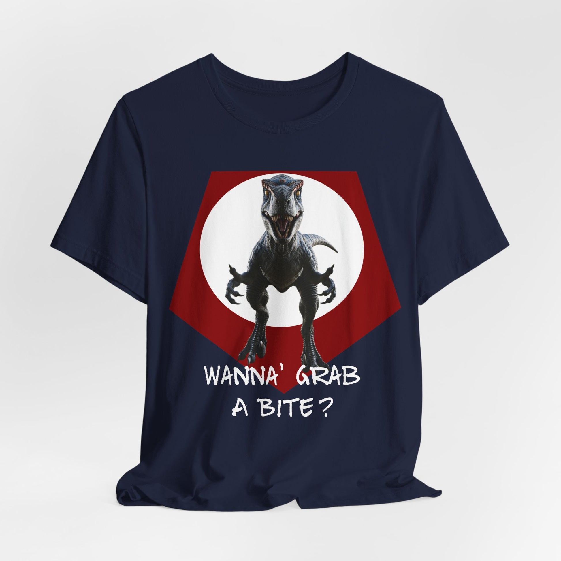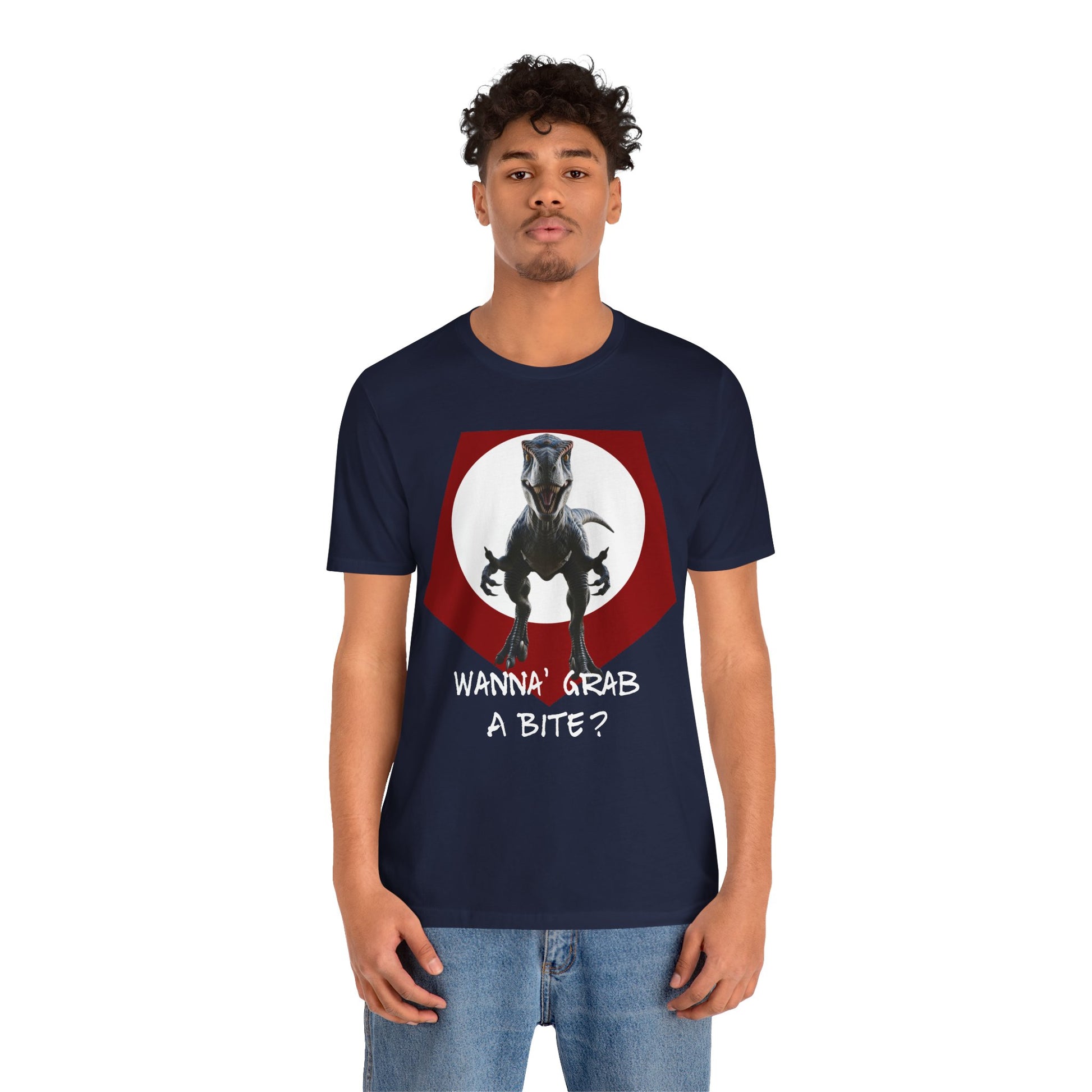 Wanna' Grab a Bite? Introducing a stylish Unisex Jersey Short Sleeve Tee that blends comfort and creativity, a funny Velociraptor tee for the chef in your life. With its playful dinosaur graphic, this tee adds a whimsical touch to any casual outfit. Perfect for everyday wear, it's ideal for a relaxed day out, outings with friends, or cozy nights in. The vibrant colors and soft texture of the fabric bring a sense of fun and ease, making it a go-to for both lounging and social activities. This tee resonates with dinosaur lovers, graphic tee enthusiasts, cooks, and anyone looking to express their playful side. It's a fantastic addition for birthdays, casual celebrations, or just because!