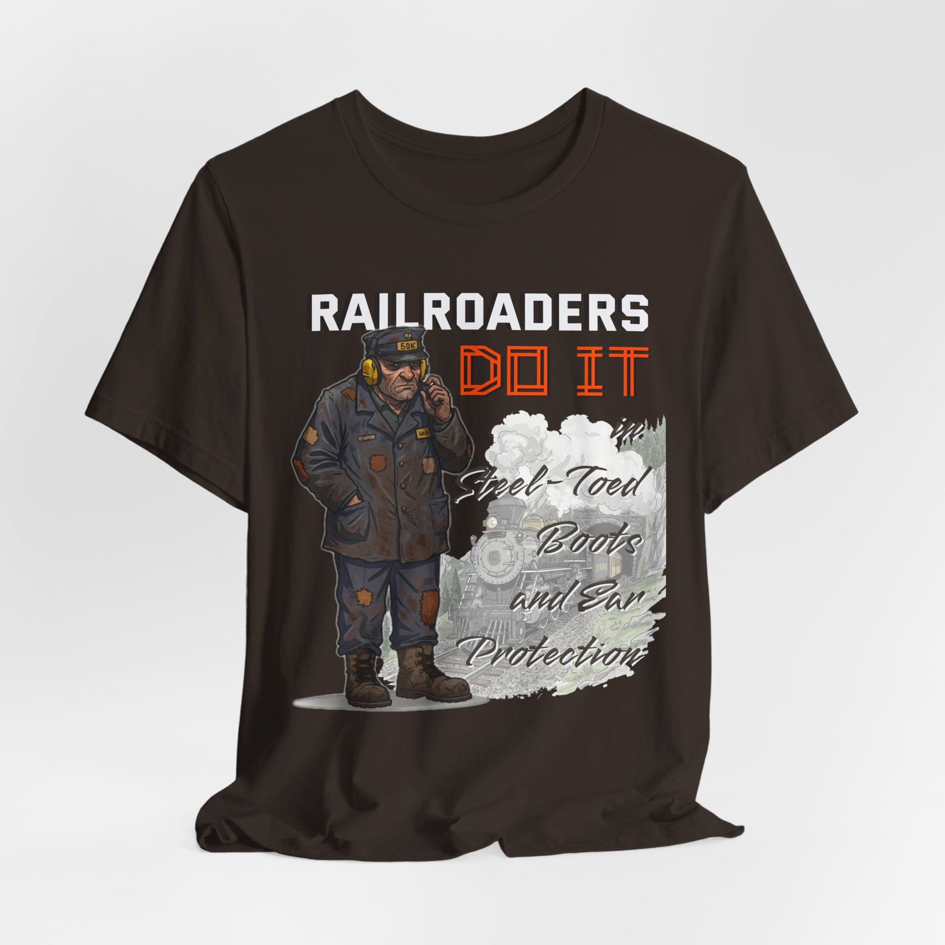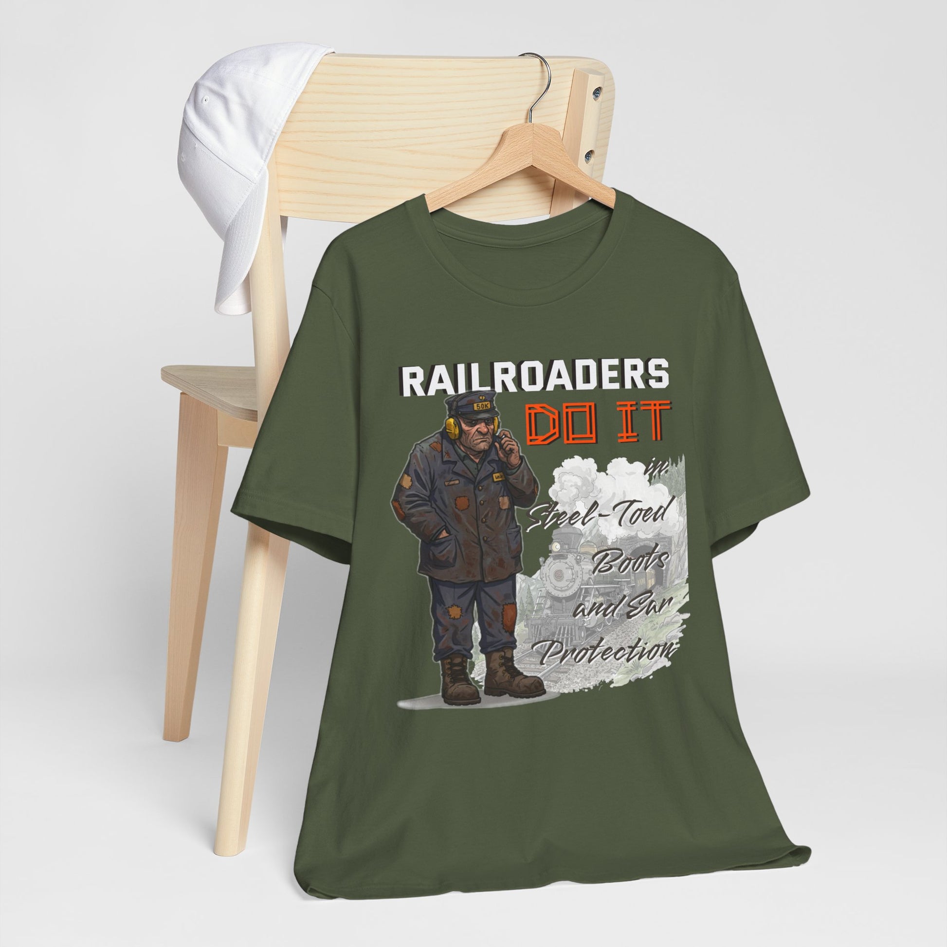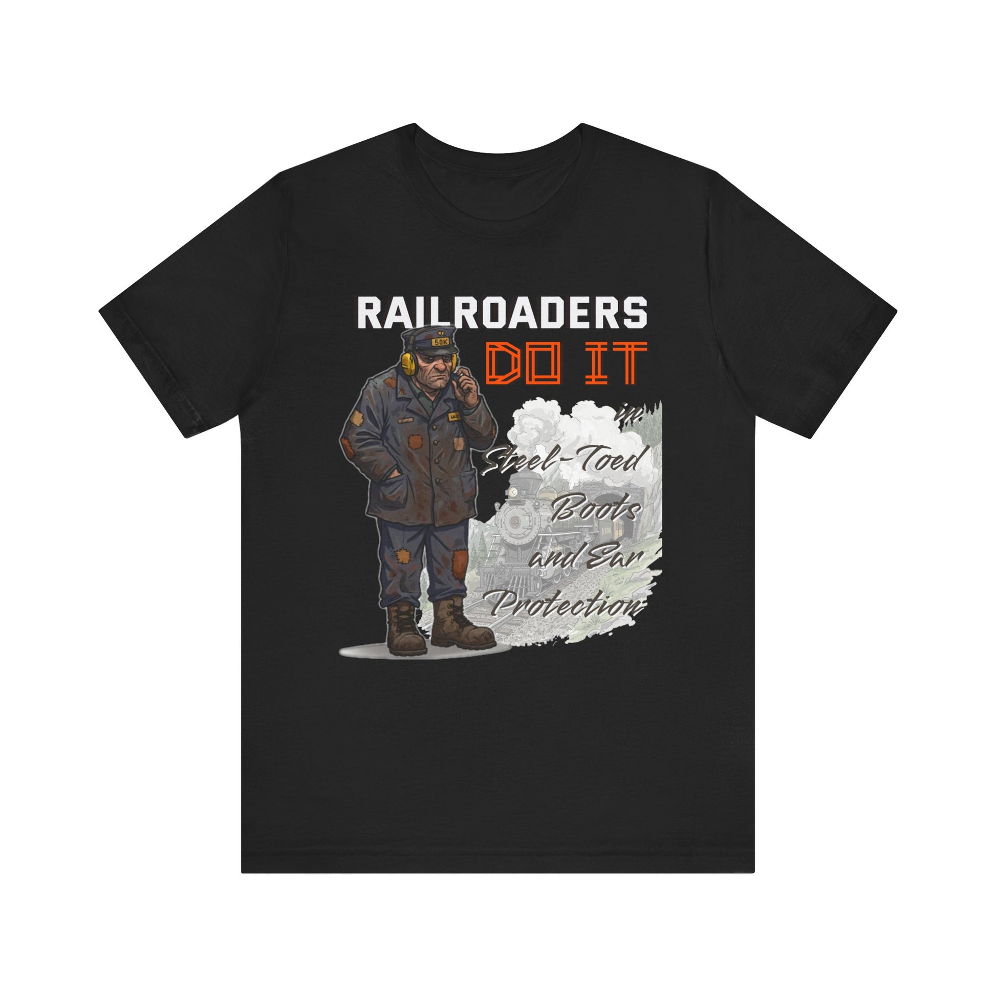 Funny railroader T-shirt featuring an image of a grizzled old conductor with the phrase 'Railroaders Do It in Steel-Toed Boots and Ear Protection'. Perfect for any rail fan, conductor, engineer, or railroad employee. Adds a touch of humor and personality to any outfit.