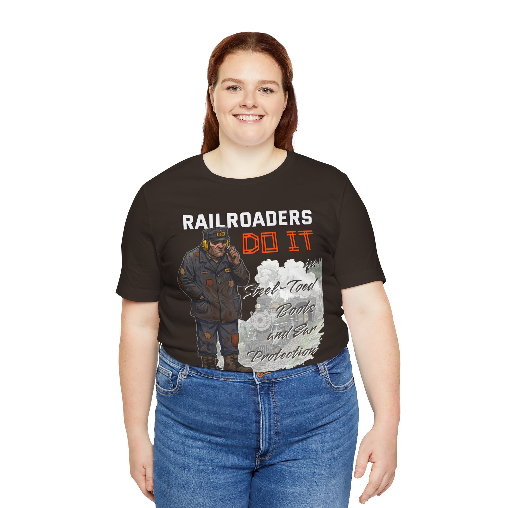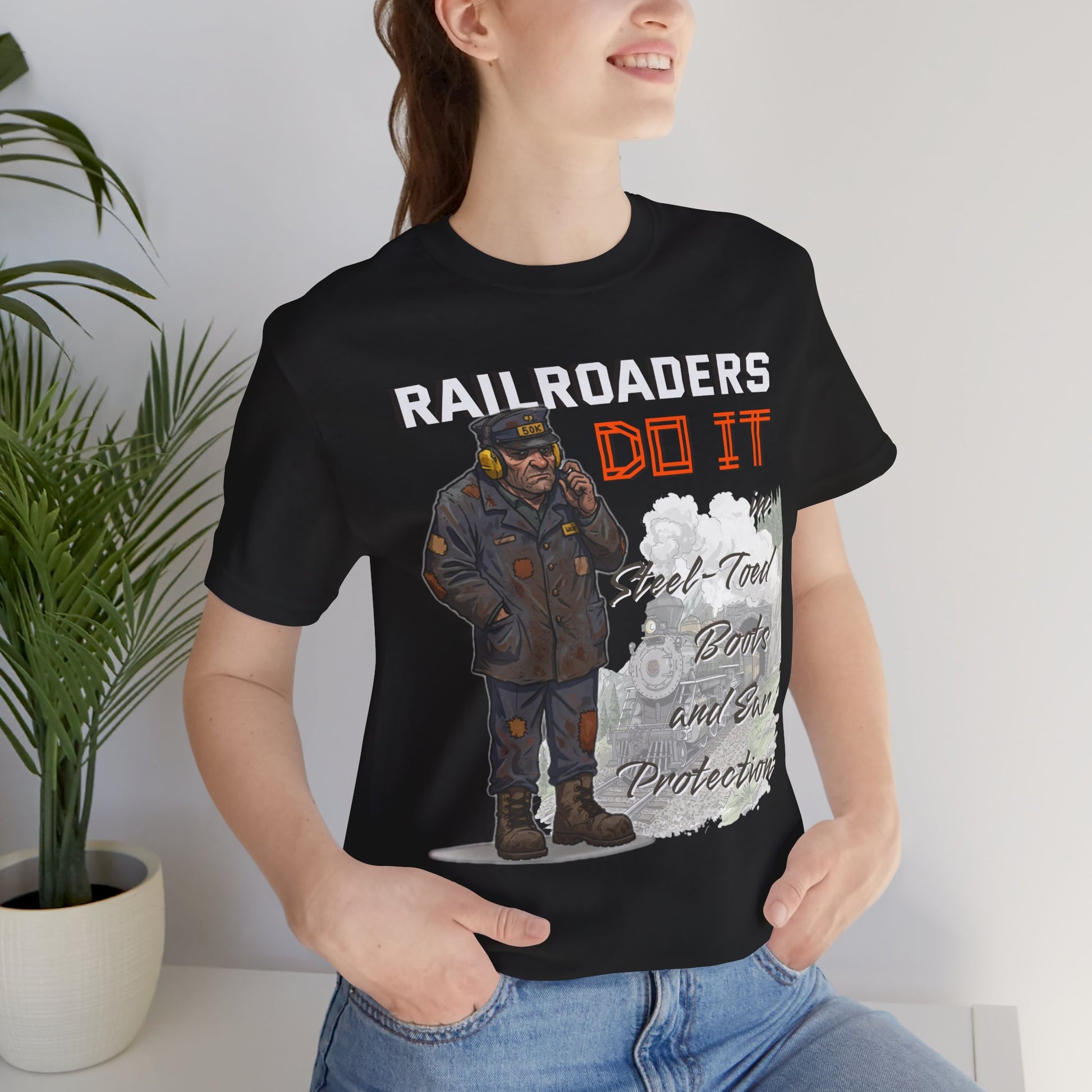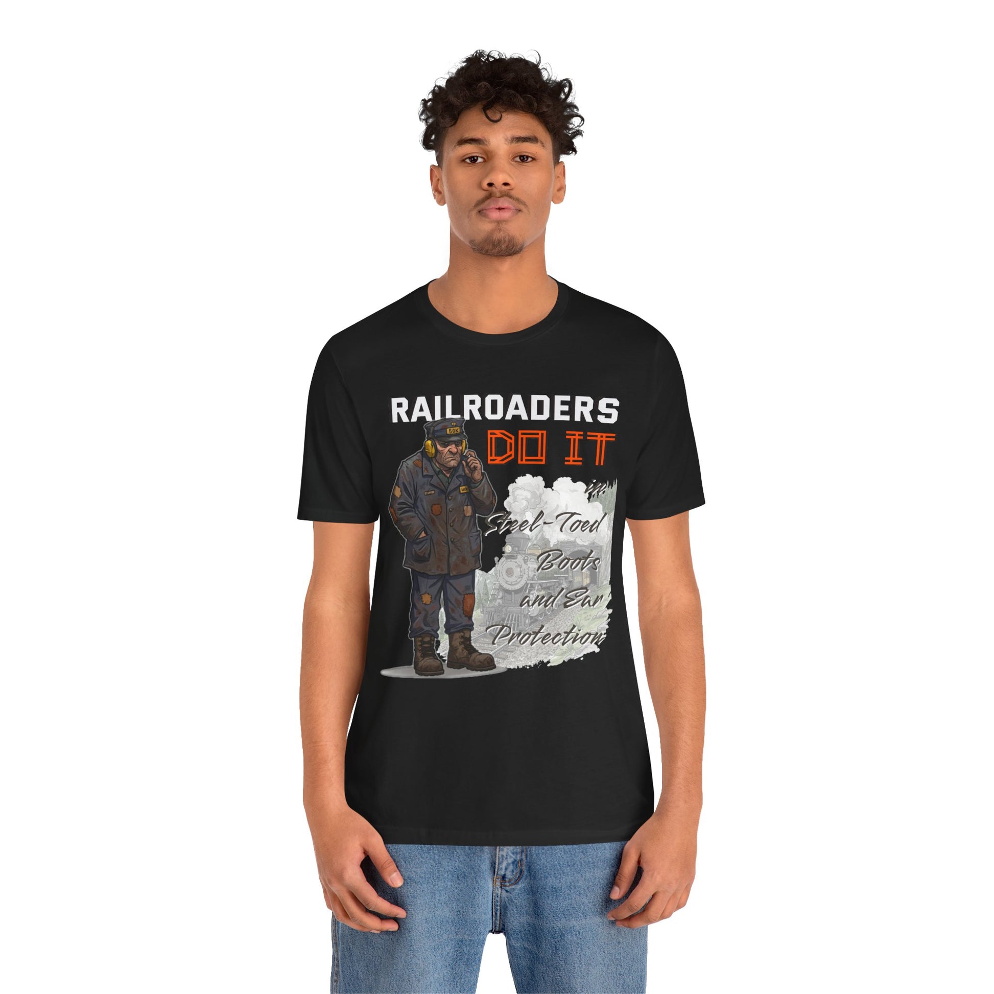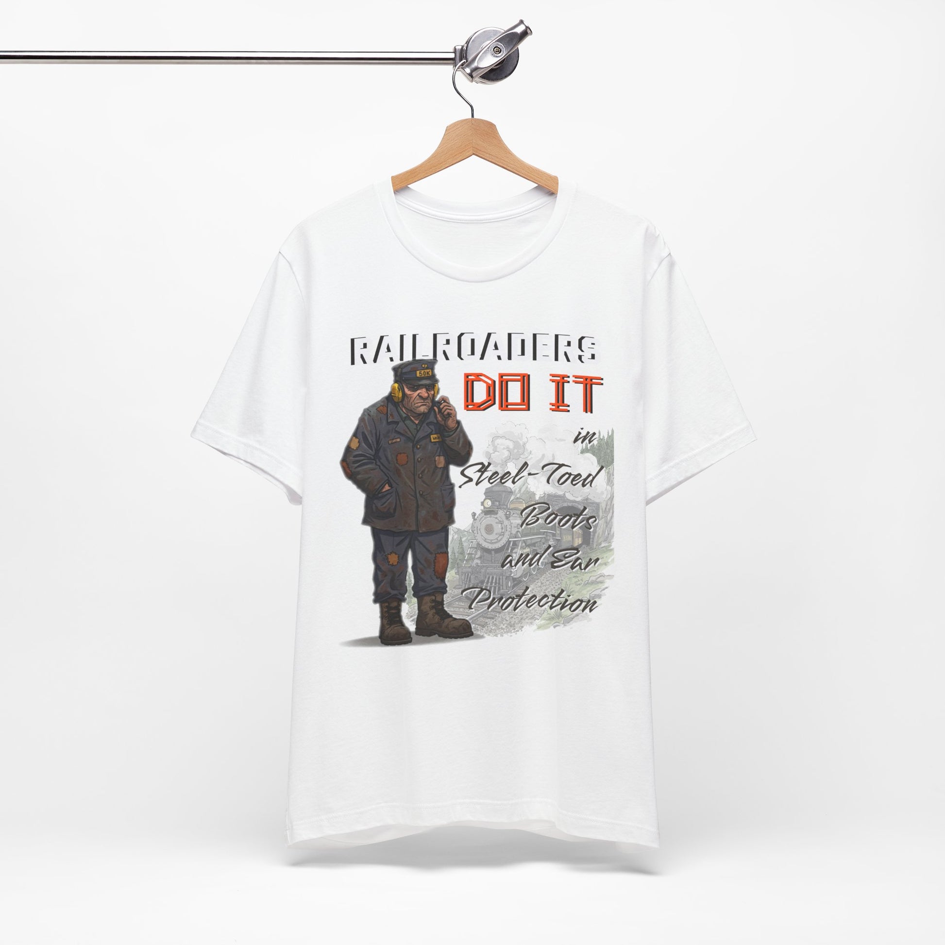 Funny railroader T-shirt featuring an image of a grizzled old conductor with the phrase 'Railroaders Do It in Steel-Toed Boots and Ear Protection'. Perfect for any rail fan, conductor, engineer, or railroad employee. Adds a touch of humor and personality to any outfit.