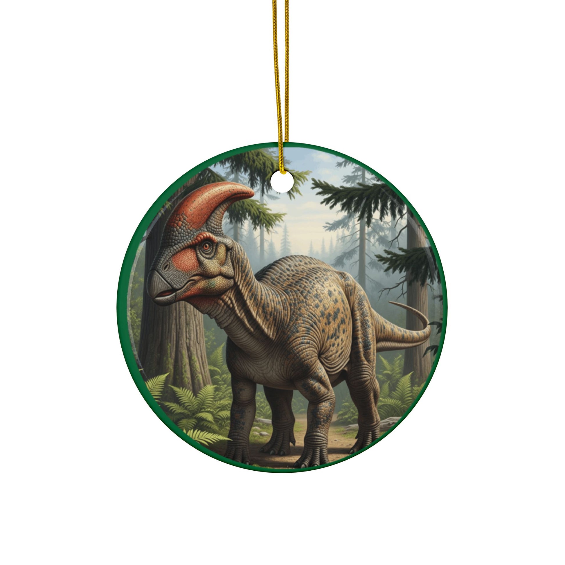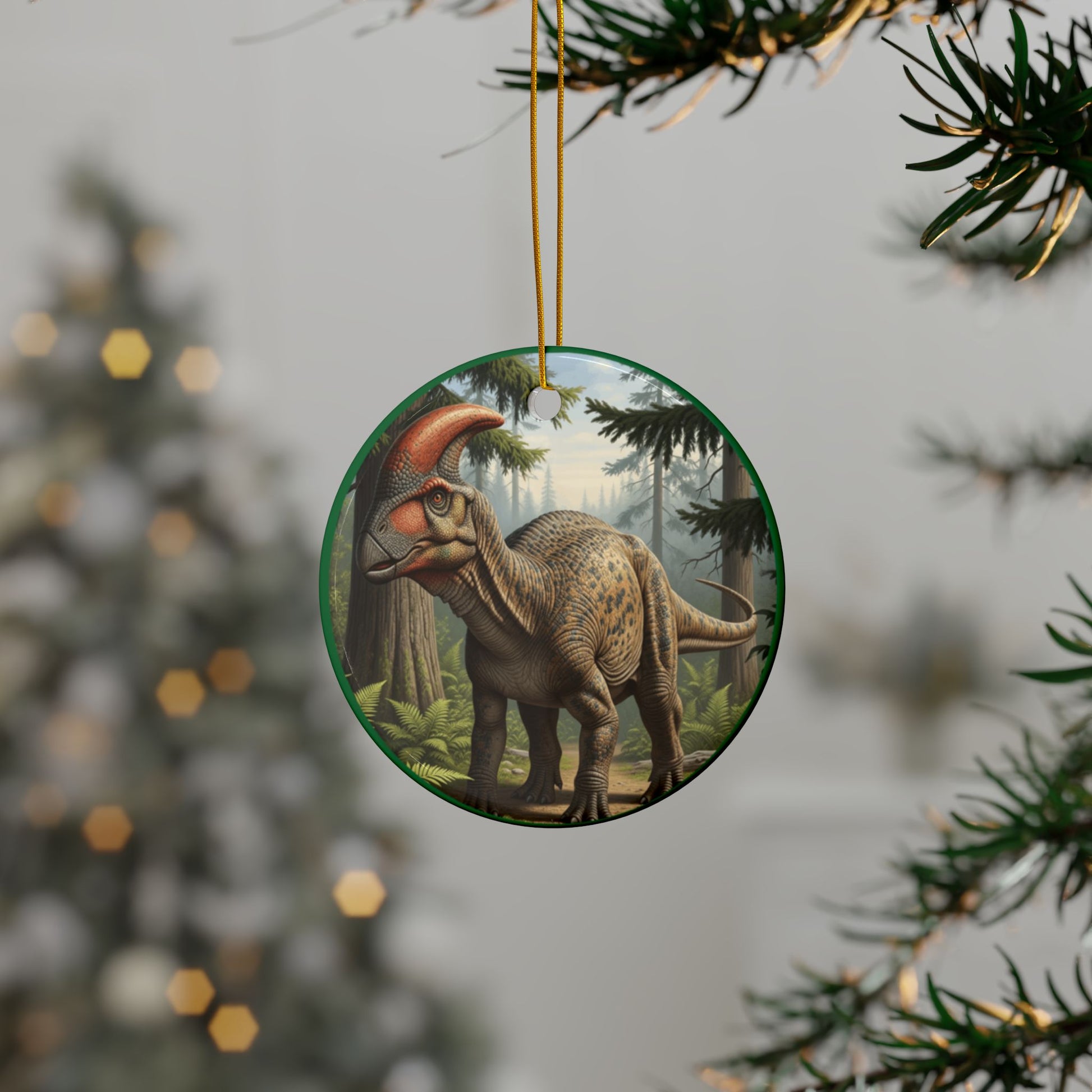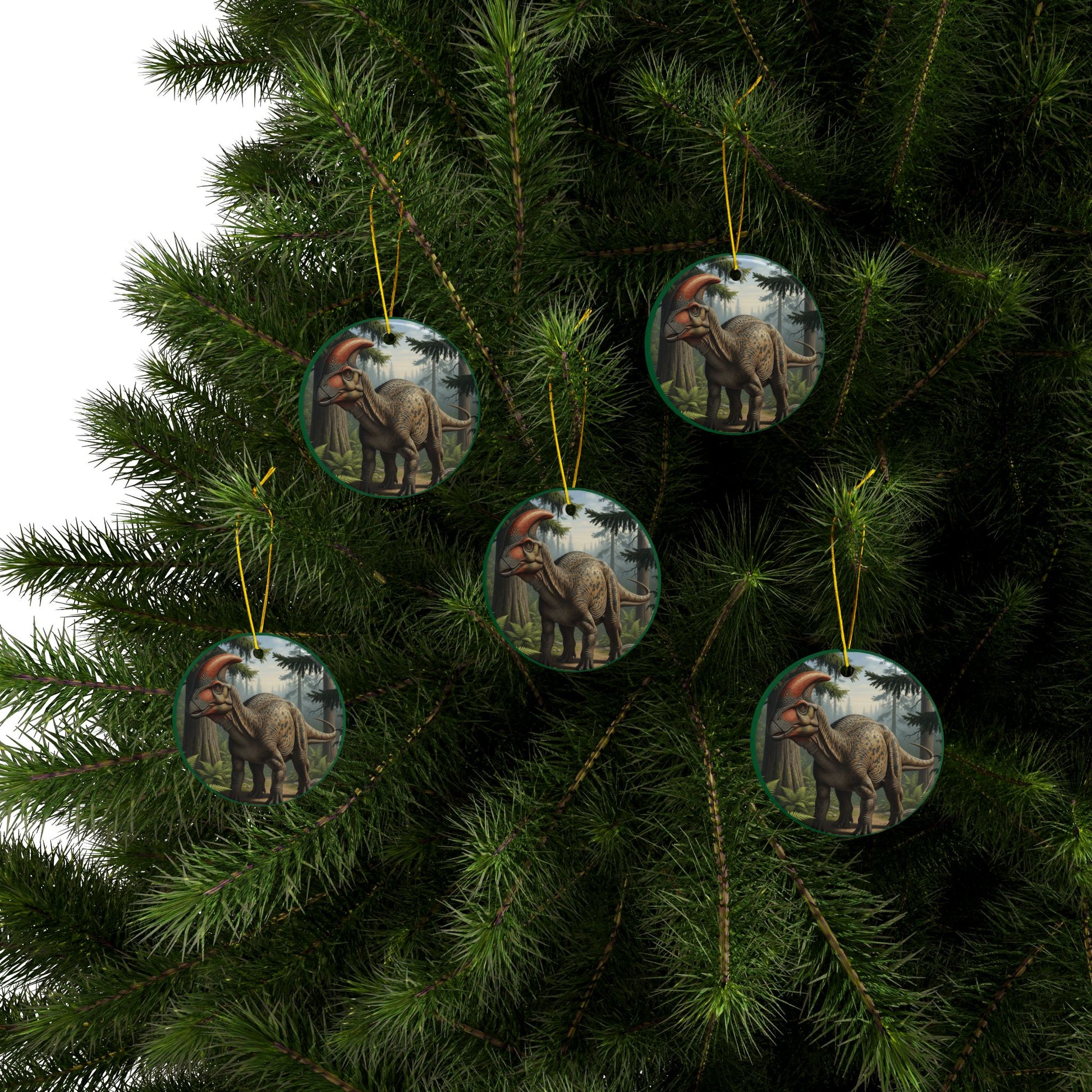 Introducing our delightful Ceramic Ornaments, perfect for adding a unique touch to your holiday decor featuring a duck-billed Hadrosaur. Crafted from 100% ceramic, these ornaments boast a glossy finish, showcasing vibrant colors that will brighten up any space. Each ornament features a stunning, two-sided print, making it visually appealing from every angle. Ideal for nature lovers and dinosaur enthusiasts, these ornaments make great gifts or keepsakes for oneself. Whether you're decorating your Christmas tree, sprucing up your home for a holiday gathering, or celebrating a special occasion, these ornaments fit seamlessly into festive atmospheres. Available individually or in bundles of 3, 5, or 10, they cater to various preferences and needs. Perfect for Christmas, birthdays, or any celebration that calls for a bit of whimsy!