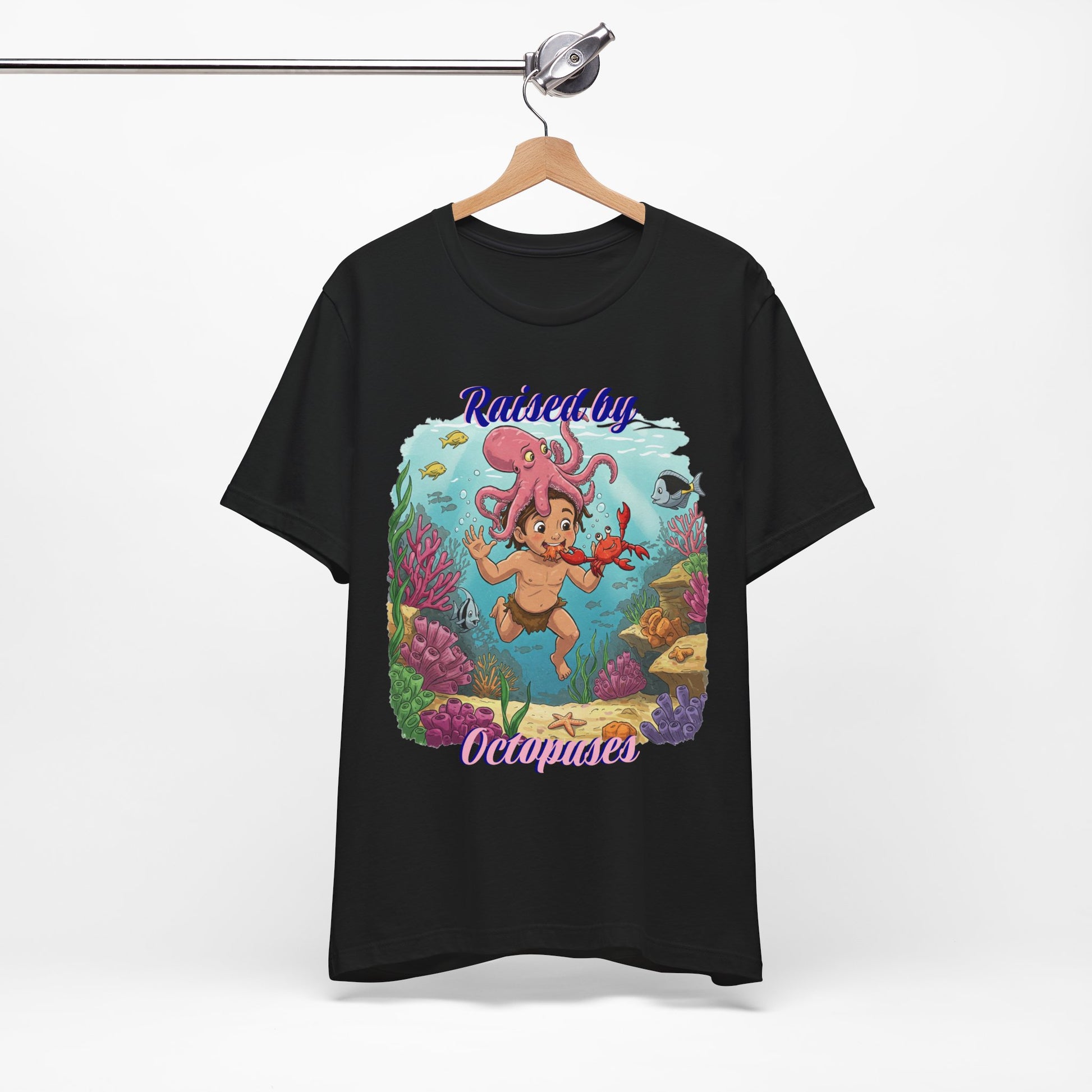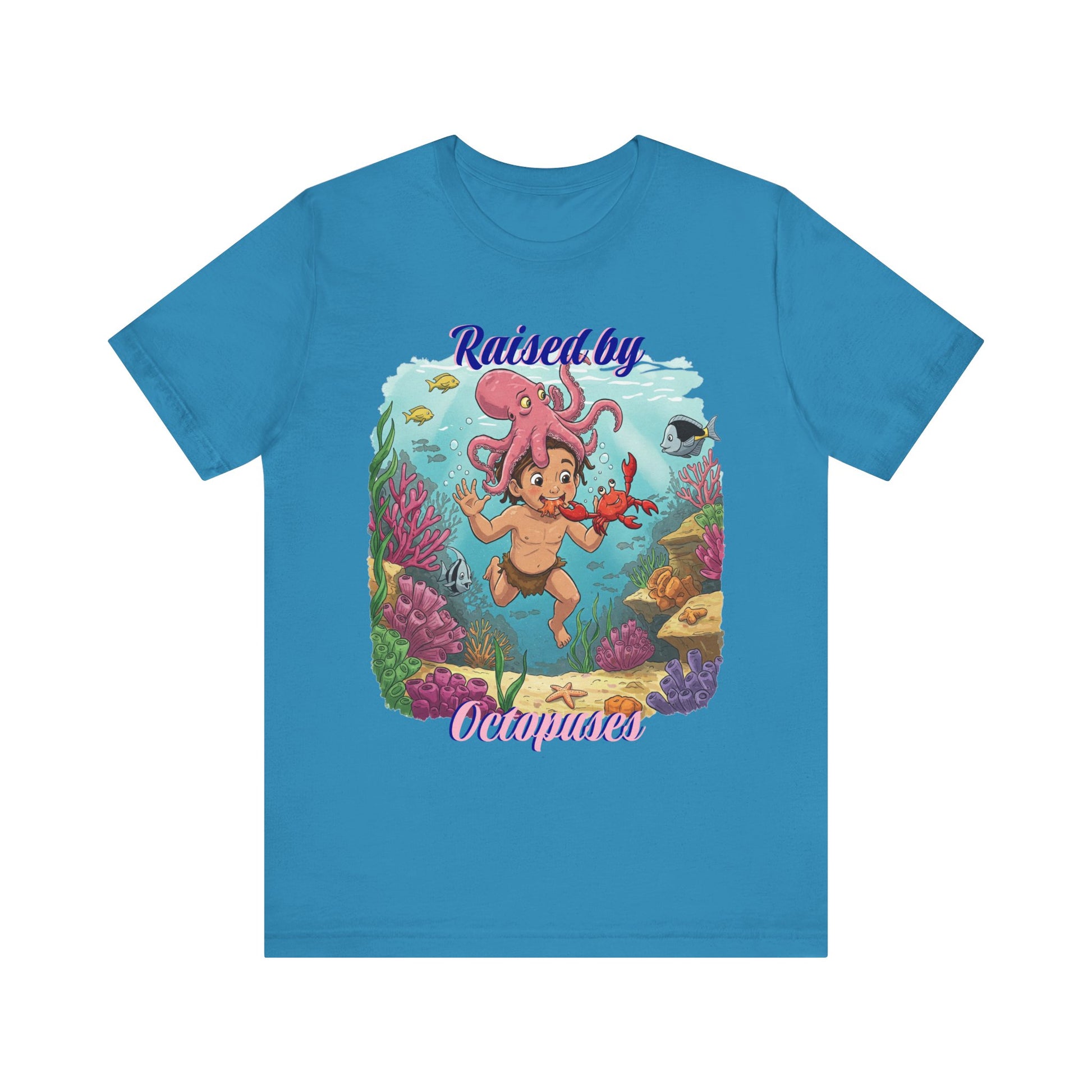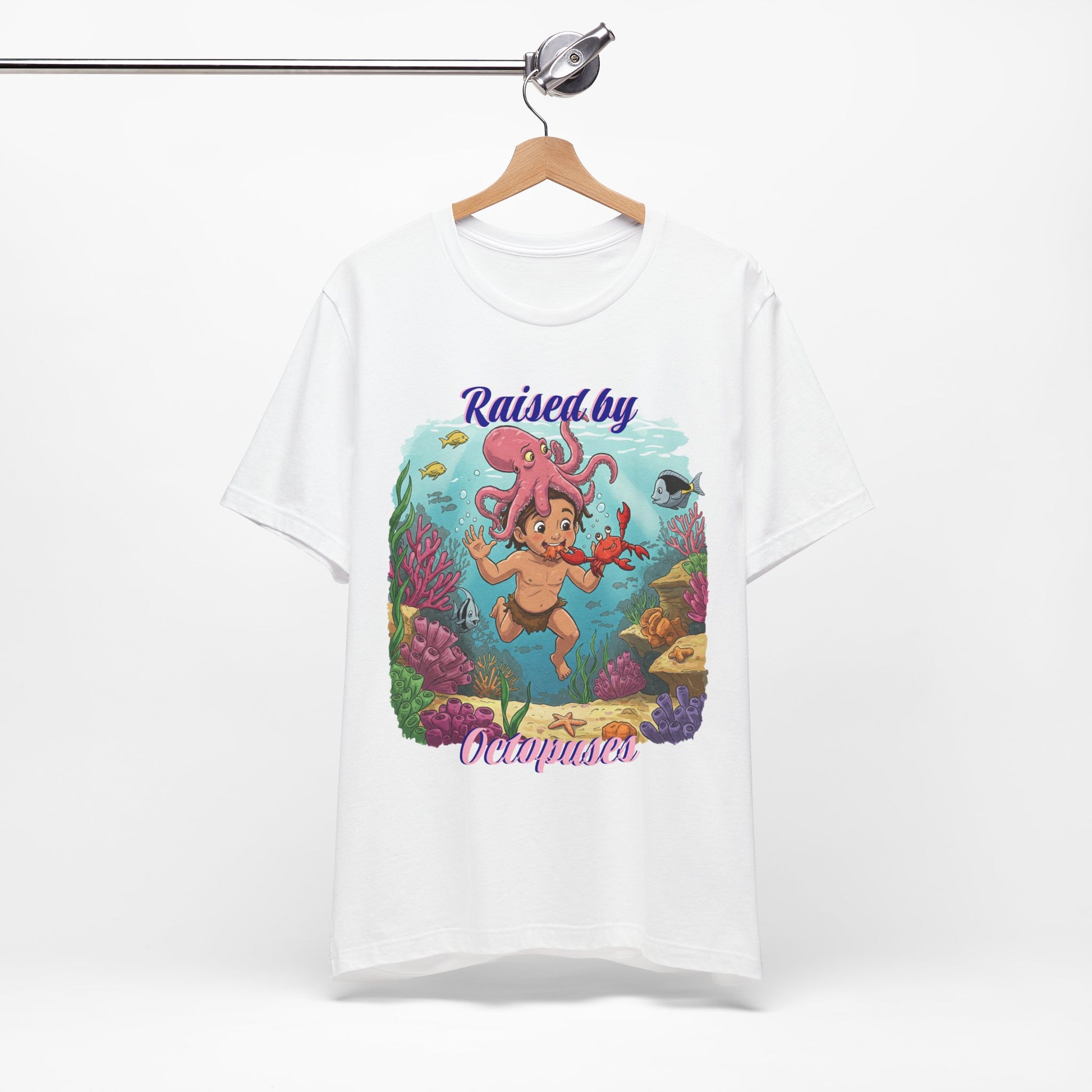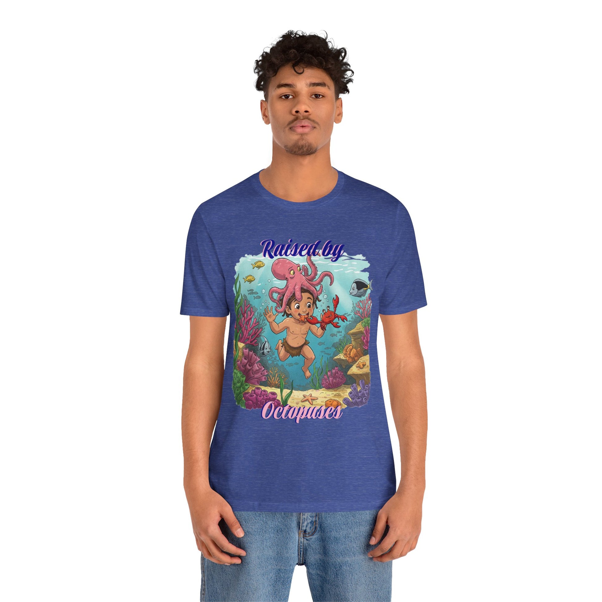 Ocean-Inspired Unisex Tee - Funny "Raised by Octopus", Fun Gift for Marine Lovers, Summer Beachwear, Cute Animal T-Shirt