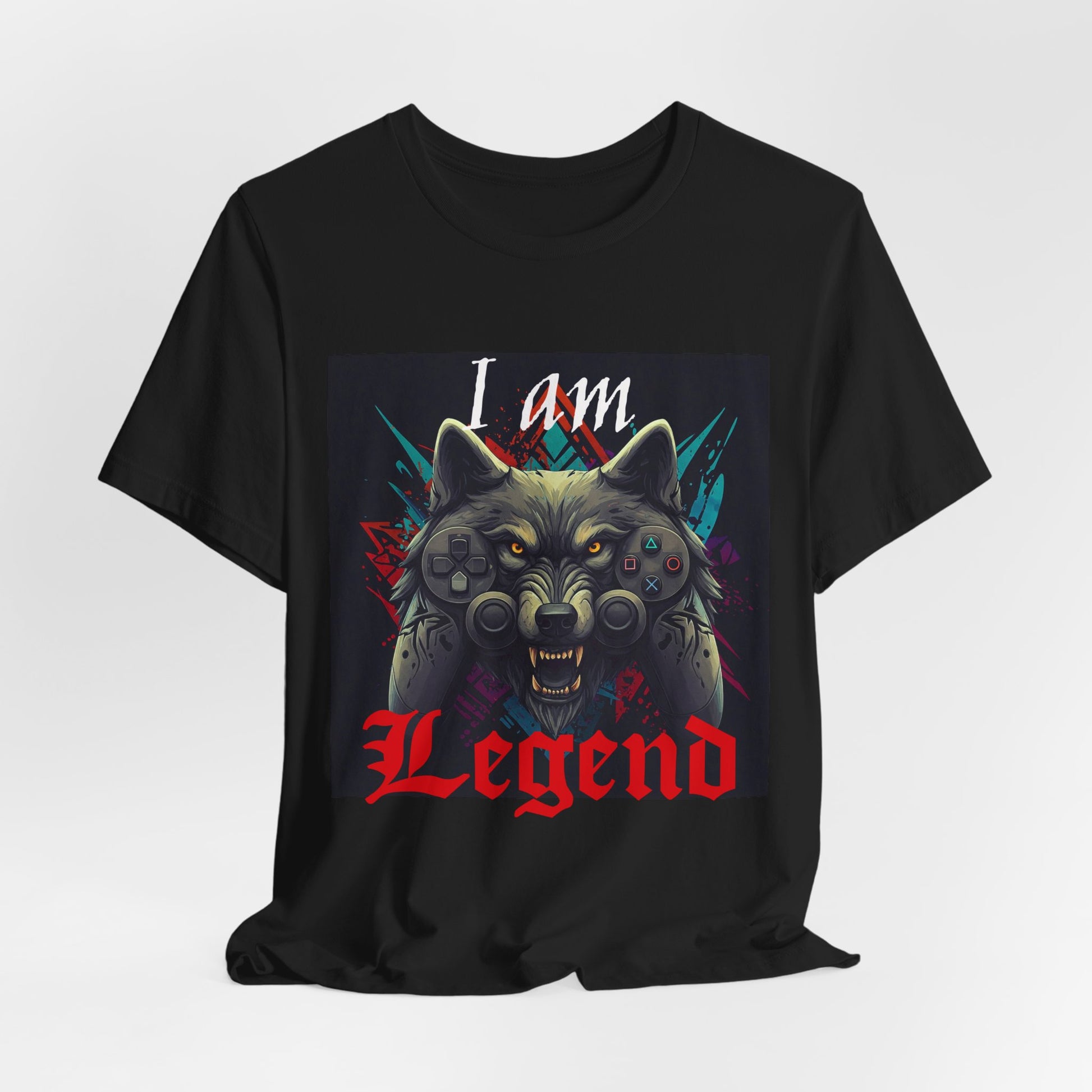 Fierce Wolf graphic gamer tee perfect for video-gamers looking to level up their style. "I am Legend." Ideal for birthdays, holidays, gamer competitions, Comic con, and game nights. Gives off a cool and edgy vibe. Relevant to gaming enthusiasts and tech-savvy individuals.